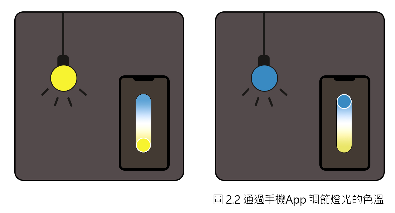 智能調光功能是智能照明產品的基本功能,也是西配置智能照明場景時的基礎操作。燈光的亮度和色溫可以實現無級調節,帶給人們不同的感受。如果是彩光燈具,其顏色也能進行調節。調光功能可以通過手機控制系統 App、語音音箱以及智能調光開關、遙控器、控制面板等實現(圖2.2)。在不同的應用場景下,燈光的色溫和亮度在大多數情況下會有所不同。本書中幾乎所有的場景模式都會應用到智能調光功能。