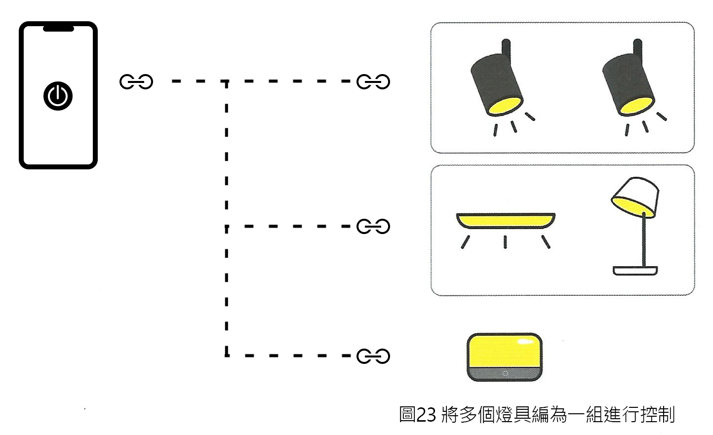 如圖2.3 所示,除了單獨操控一個燈具外,智能照明系統還可以批量對燈具進行管理和操作,這是通過手機App 將燈具進行分組來實現的。完成燈具分組後,可以對同一組燈具執行相同的操作,例如操控該組的開啟和關閉,或調節燈組裡的燈具為同一色溫和亮度。燈具分組功能應用廣泛,使場景設計更加多樣和靈活。此外,利用分組的原理也可以對燈具進行分區,比如將客廳中的所有燈分為一組,並在 App 中設置空間名稱為“客廳”。如果想打開客廳的所有燈,可以通過手機App 或其他控制方式一次性打開。