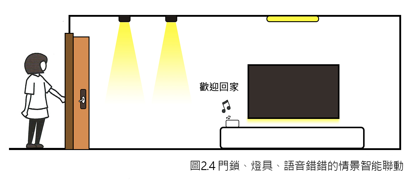 「無聯動,不智能」,智能聯動方案是實現智能家居場景體驗的關鍵。通過智能場 場景的設置,結合與控制面板和傳感器等設備的聯動,可實現更多無感式、人性化、自動執行的智能照明場景。常見的智能照明聯動方案是智能燈具搭配人體傳感器、門窗傳感器等,與其他智能家居產品(智能音箱、智能門鎖、智能窗簾等)進行聯動。比如,如果將燈具和門鎖以及語音音箱聯動,當回家打開家門時,從玄關到客廳的燈依次亮起,語音音箱播報「歡迎回家」,這就是為「回家」這一活動設計的智能聯動方式(圖2.4)。本書將會詳細講述多個常用的智能聯動情景的設置方式。