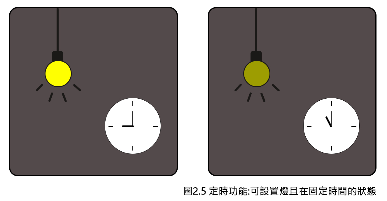 智能照明系統的定時功能可以按照生活習慣,將某個場景模式的開啟和關閉固定在某個時間,這樣就能免去主動觸發場景的麻煩。比如可以設置晚上9點,「助眠模式」開啟,臥室的燈光緩緩開到一個合適亮度;然後亮度逐漸變暗,直到深夜11點自動關閉全部燈光(圖2.5)。此外,火丁具之間或者燈組之間,可以設置一定時間間隔。這樣在配置某些場景時,燈具不再同時亮起,而是依次亮起,增加空間燈光模式的趣味和燈光開啟時的儀式感。