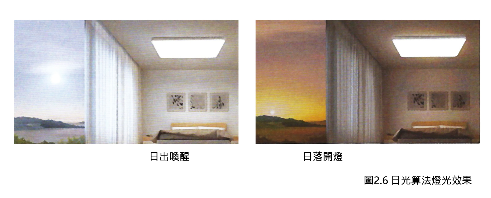 智能照明系統需具備“日光算法”,即能根據所處地的經緯度和日期,推算出當地的日出和日落時間。當日出“喚醒模式”開啟時,燈光的色溫和亮度均與自然光同步。當日落時,燈光模擬黃昏的色溫和亮度(圖2.6)。通過模擬自然的變化,讓室內照明隨著自然光一起變化,並且搭配智能窗簾的開啟和