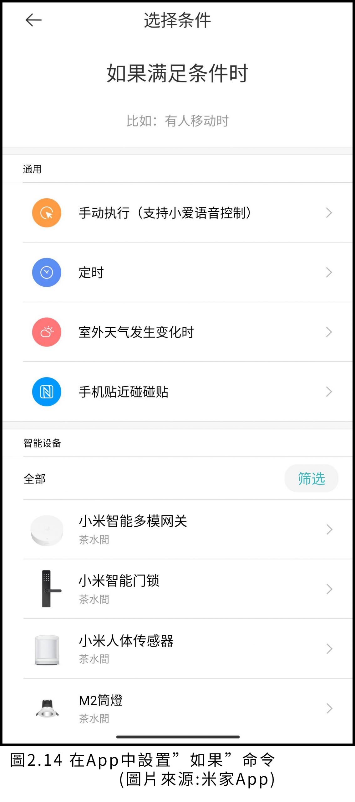 如圖2.14中,「如果」命令有兩類。一類是通用條件,包含四種設定方式(不同的手機操作系統會有所不同):手動執行、離開或到達某地、定時、室外天氣發生變化時。