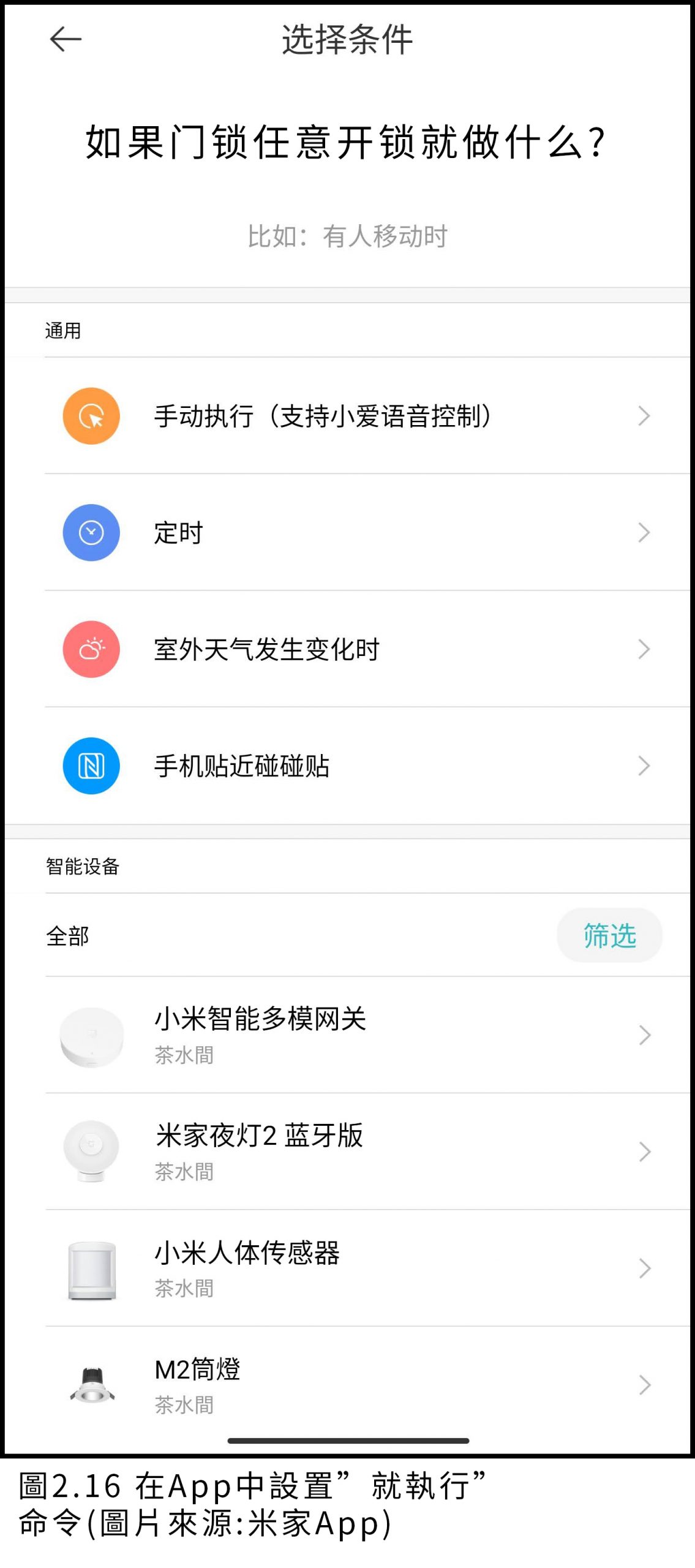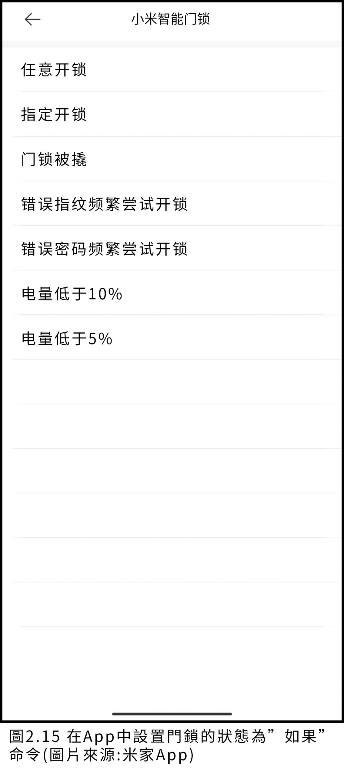 另一類是智慧裝置的條件,以智慧門鎖為例,其有如圖2.15 所示的七種條件可以設定為「如果」命令。