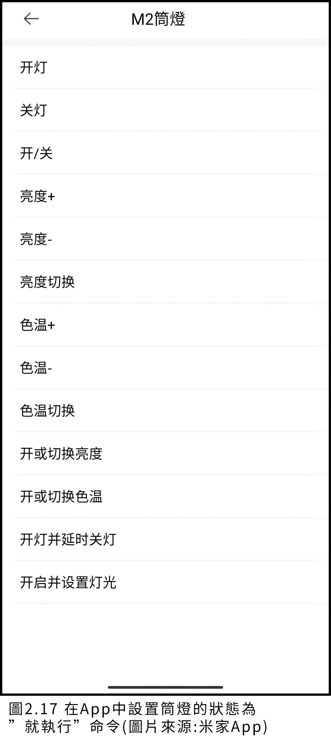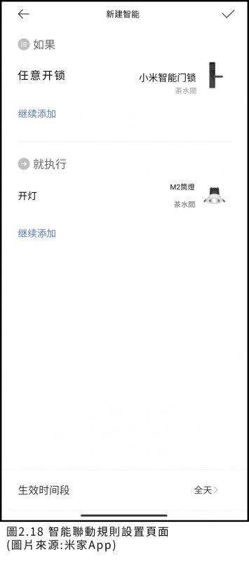 吸頂燈為例,其有如圖2.17 所示的十幾種條件可以設定為「就執行」命令。「如果」和「就執行」命令都可以是多個命令的組合形式。當「如果」和「就執行」都設定完成後(圖2.18),智能聯動規則就基本設定完成了。
