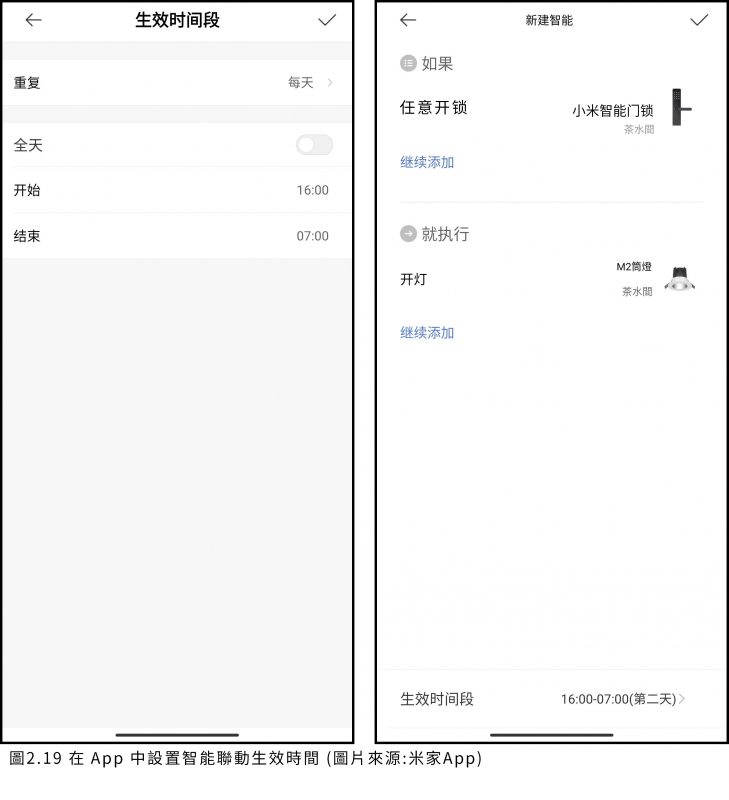 智慧聯動預設生效時間是全天,但有時我們只想在一天中特定時段使用或者某幾天使用,那麼可以根據需求設定其生效時間(圖2.19)。至此,整個智慧聯動場景就設定完成了,保存后即可使用。