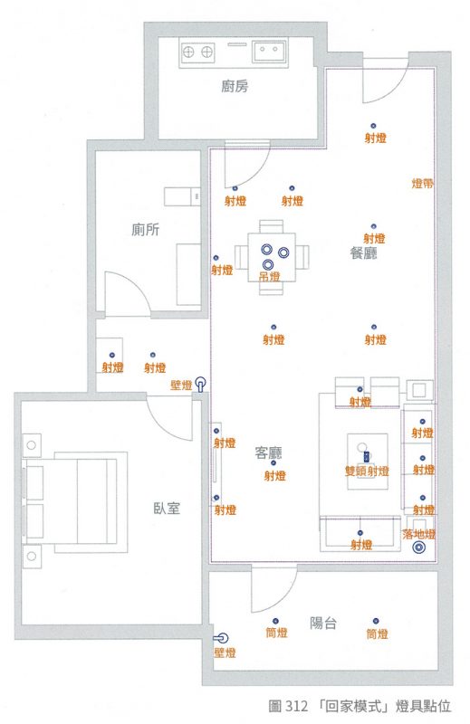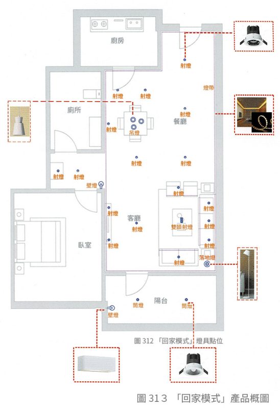 這次的設計案例是針對玄關、餐廳、客廳這三個空間的燈具點位做設計(圖3.12)。針對玄關、餐廳、客廳和陽臺四個空間,使用筒燈、射燈、雙頭射燈、吊燈、燈帶、壁燈、落地燈這7種燈具(通常,設計師在提供燈具點位圖時,會同時提供產品概圖供參考,如圖3.13所示)。確定好光源的空間佈局和燈具型式後,就可以按照「由低到高」或「由近到遠」漸進式照明的設計原則,將燈具分組。