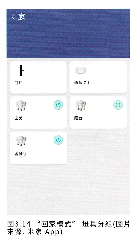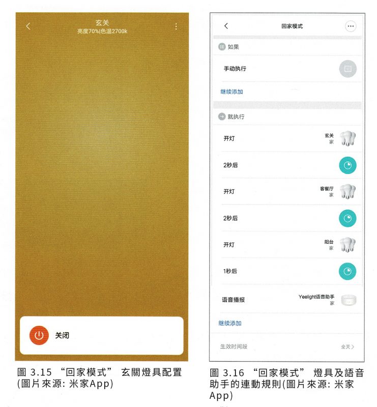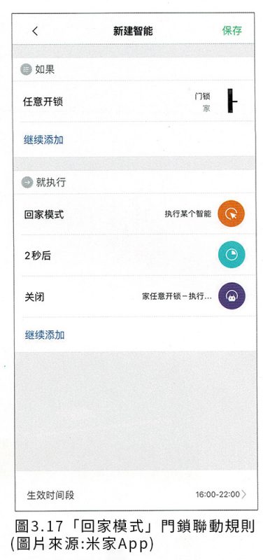 如圖3.17 所示,將「如果」命令的觸發條件設定為智慧門鎖的開啟。而在「就執行」命令裡,第一行命令是上一個步驟中設定的燈和語音助手的聯動規則。需要特別注意的是,在這條命令結束2s后,將會執行一行把「如果」命令關掉的命令,也就是將整個智慧聯動功能關掉。這樣做的目的是保證只執行一次「回家模式」,也就是隻有第一位回家的成員才執行「回家模式」。最後將智能聯動的生效時間段按照平時的生活習慣設置好,整個智慧聯動規則就設定完成了。