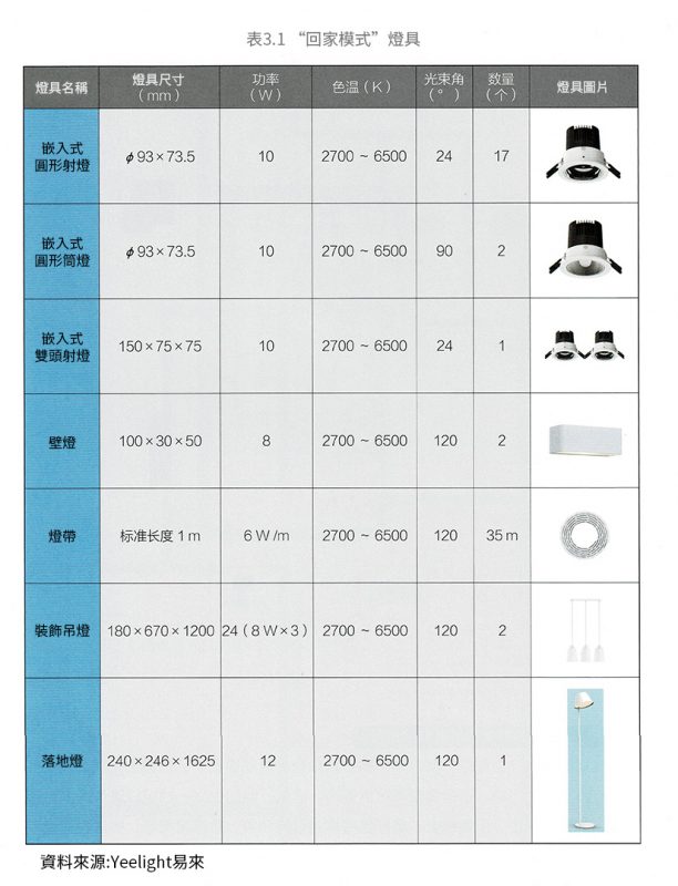 考慮到需要與其他智慧裝置聯動,下面給出的方案中(表3.1、表3.2),燈具的無線連線方式均為藍芽(BLE Mesh)。雖然燈具數量會達到二十幾個,但是由於藍牙連線方式的特性,可支援快速批量裝置接入。