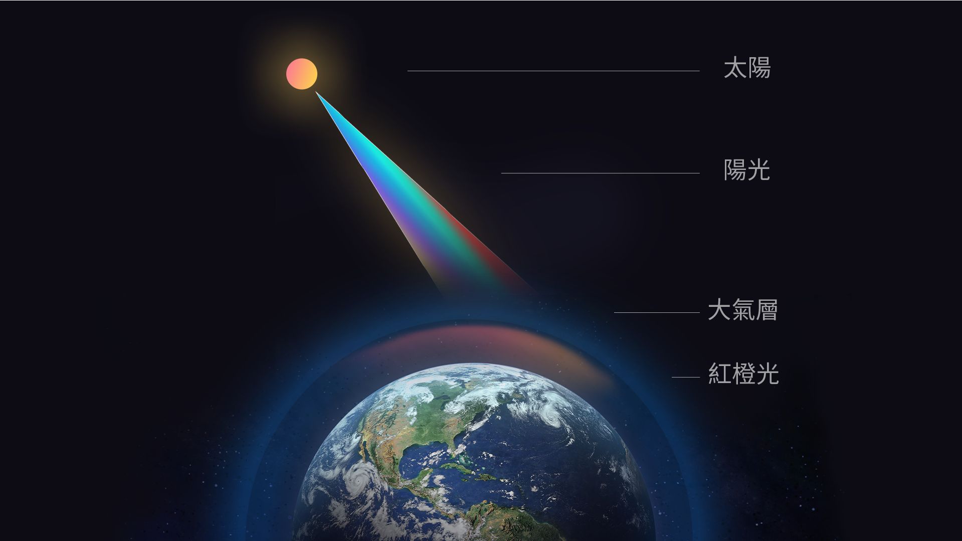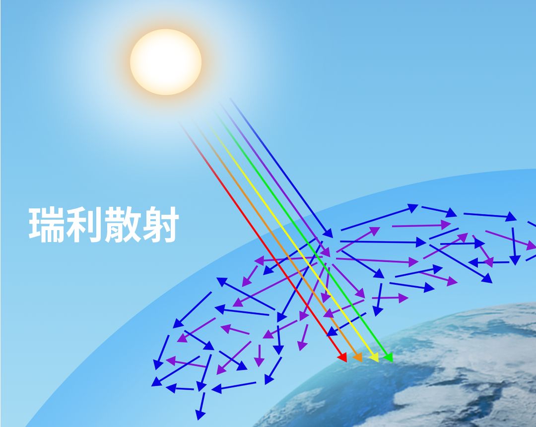 太陽光經過大氣層之後是被大氣層奈米級的粒子折射之後出現了瑞利散射效應,藍色的光被散射,橫向展開變成了藍天的效果,然後其他光譜的光穿過大氣層之後照到地面上,就是平常我們感受到的自然光。